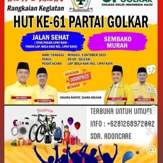 KAMPAR – Dalam rangka memperingati Hari Ulang Tahun (HUT) ke-61 Partai Golkar tahun 2025, Dewan Pimpinan Daerah (DPD) Partai Golkar Kabupaten Kampar menyiapkan serangkaian kegiatan yang melibatkan masyarakat dari berbagai kecamatan. Rangkaian kegiatan tersebut mengusung semangat kebersamaan, kesehatan, dan kepedulian sosial.